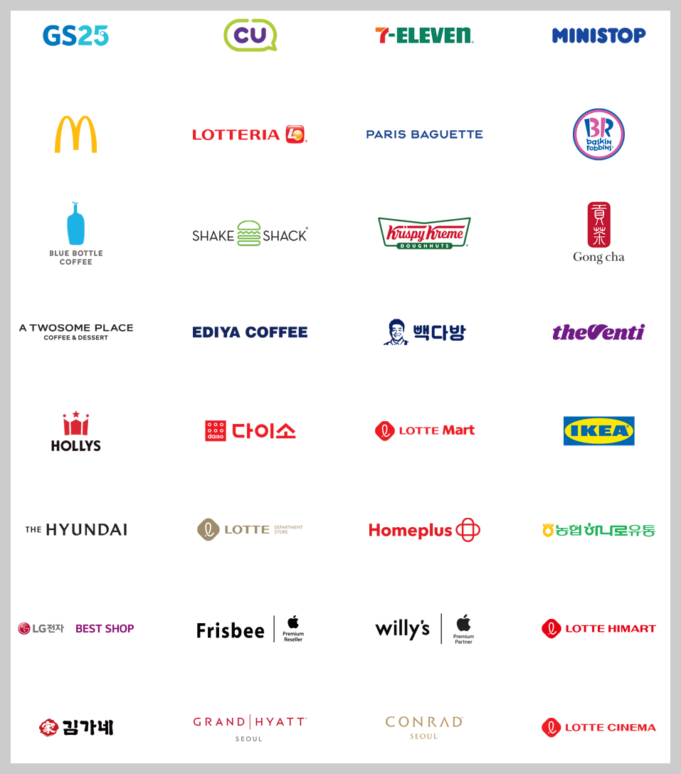 (코스트코, 투썸플레이스, 롯데백화점, 홈플러스, 편의점 등의 오프라인 가맹점은 물론, 배달의민족, 무신사, GS샵, 폴바셋, 롯데시네마.....등)