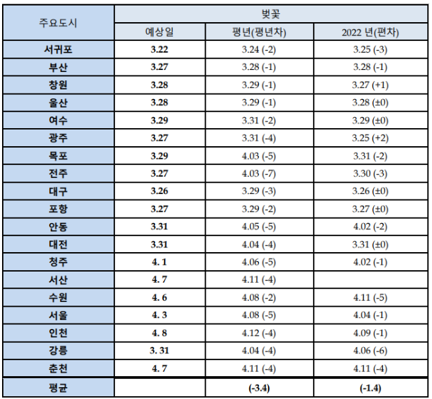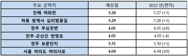 일단에 그에 앞서 2023년도 벚꽃 개화시기를 지역별로 알아보겠습니다. 해당 자료는 기상 예보 사이트인 웨더아이에서 가지고 왔습니다 ~